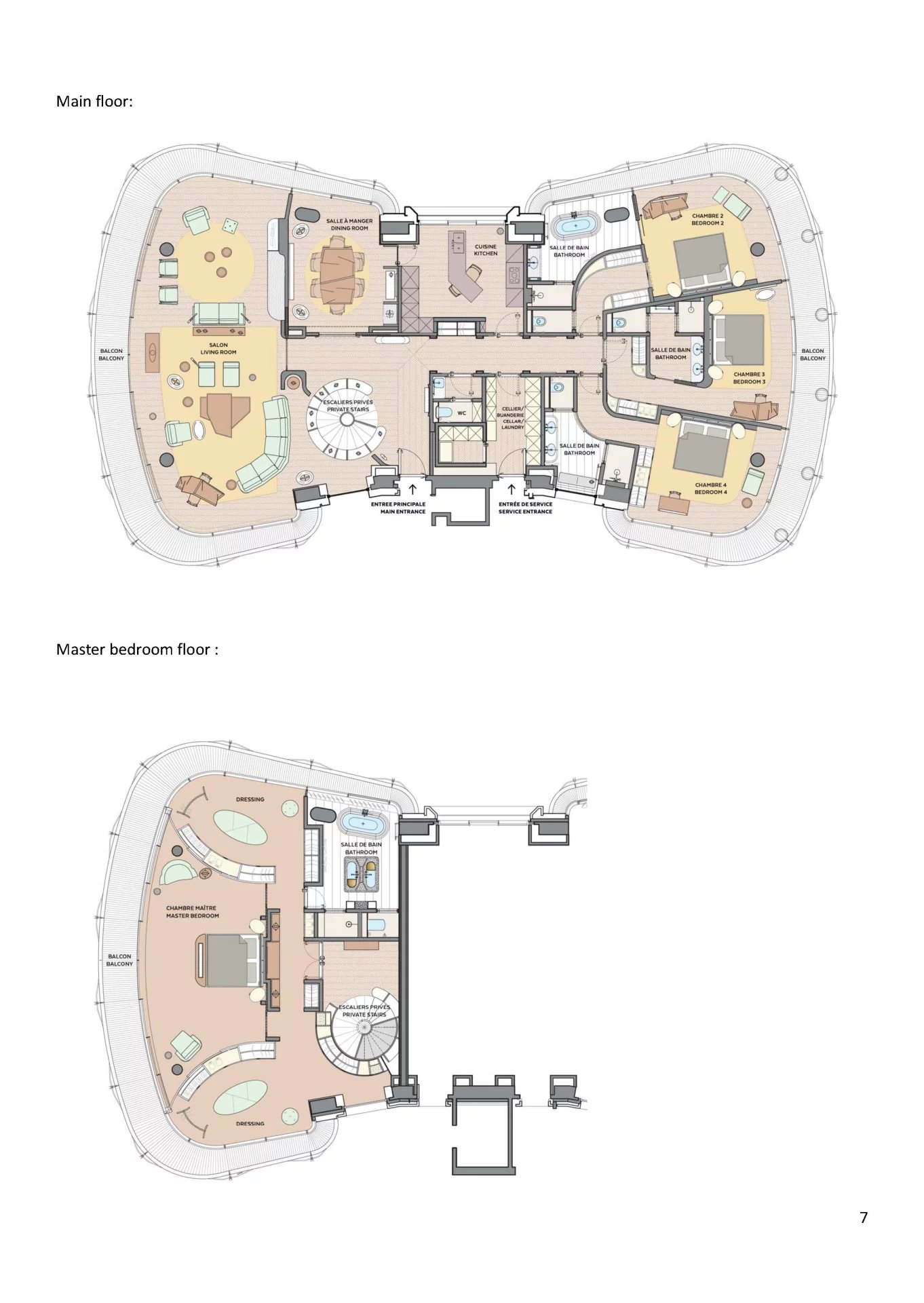 -Le niveau inférieur est réservé à la chambre de maître, avec salle de bains et deux dressings.